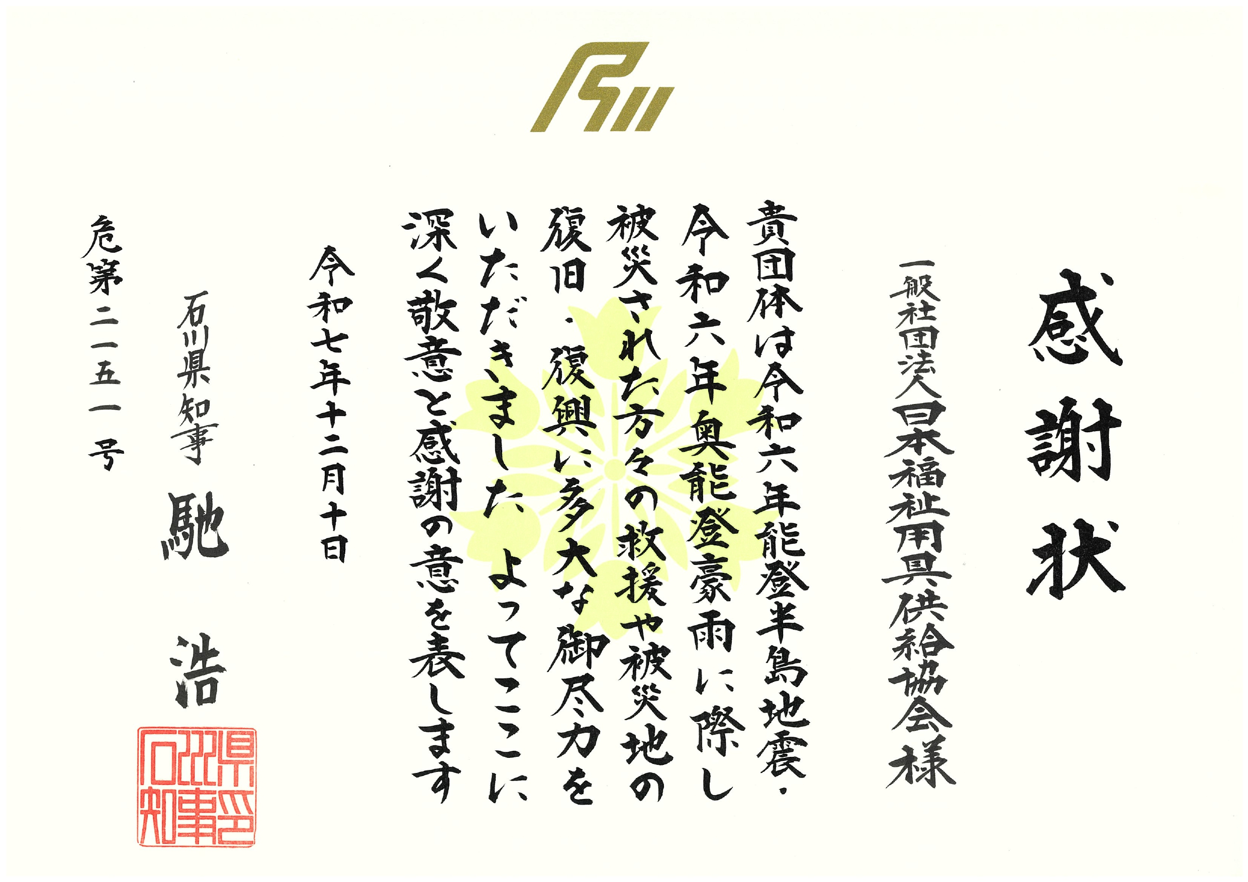 〜情報提供〜当協会の福祉用具物資供給に対し、石川県知事より感謝状が贈呈されました