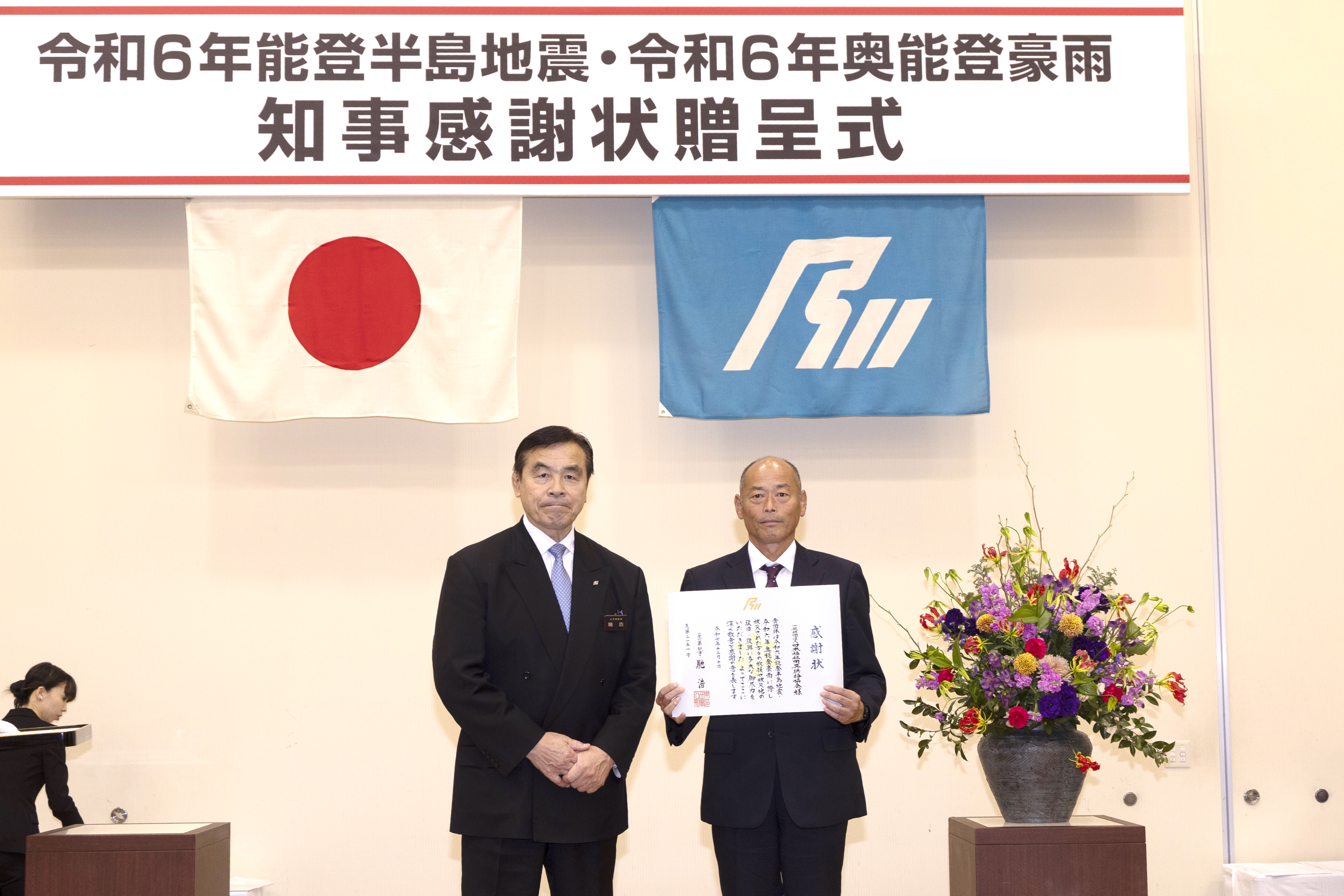 12月10日(水)、石川県金沢市の石川県地場産業振興センターにて、令和6年能登半島地震及び奥能登豪雨で被災された方々の救済や被災地の復旧・復興に貢献した機関・団体に対する石川県知事の感謝状贈呈式が開催され、当協会からは小浦勇一石川県ブロック長(有限会社さわやか金沢代表取締役)が出席し、馳浩石川県知事より感謝状の贈呈を受けました。